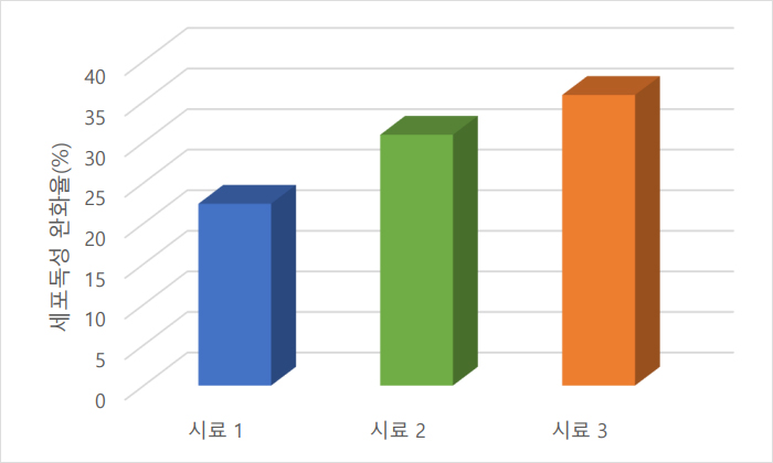 - 특징 : 구성성분이 모두 천연 물질로 이루어짐에 따라, 합성 항산화제가 나타내는 피부자극, 발암성과 같은 부작용을 발생시키지 않는다. 더욱이, 피부노화의 주된 원인 중 하나인 자외선이 조사되었을 때, 자외선에 의한 세포독성을 완화시켜줄 수 있다. 또한, 콜라겐 분해 효소 MMP(Matrix metalloproteinase)는 자외선 조사에 의해 발현이 촉진되지만, 본 발명에 따른 추출물은 MMP의 발현을 유의적으로 억제할 수 있으며, 이에 따라 콜라겐의 분해를 효과적으로 방지하여 피부 탄력을 개선하고 노화 진행을 억제할 수 있다.